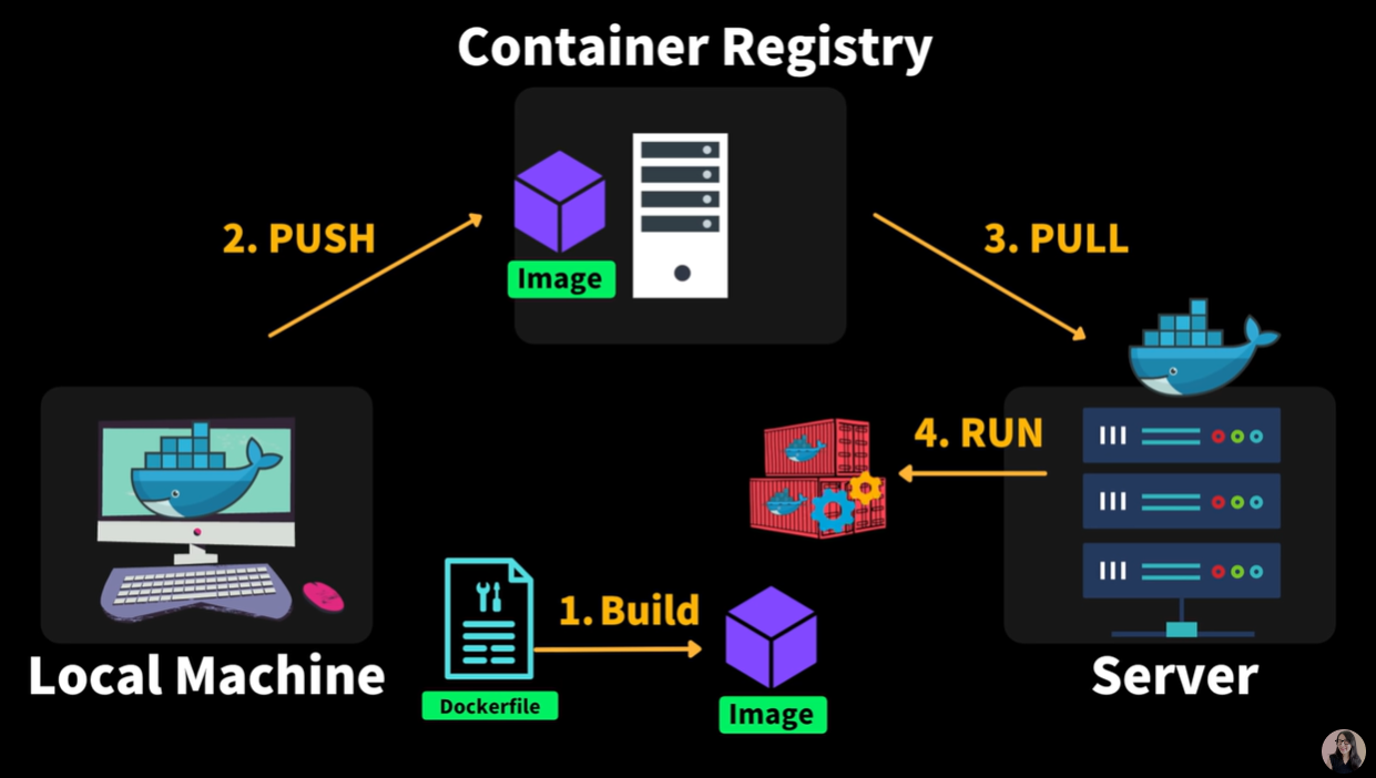로컬과 서버에 각각 도커를 설치하고 이미지를 업/다운로드 가능한 Container Registry (Docker hub(public), AWS(private) 등) 을 이용한다.
