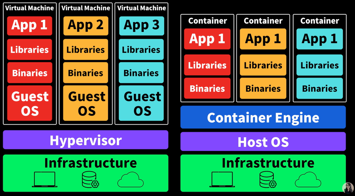 - 도커 : OS단까지 내려가지 않고 실행 환경만 독립적으로 가동하기 때문에 컴퓨터에 직접 설치한 것과 크게 성능 차이가 나지 않음 (가볍고 빠름)