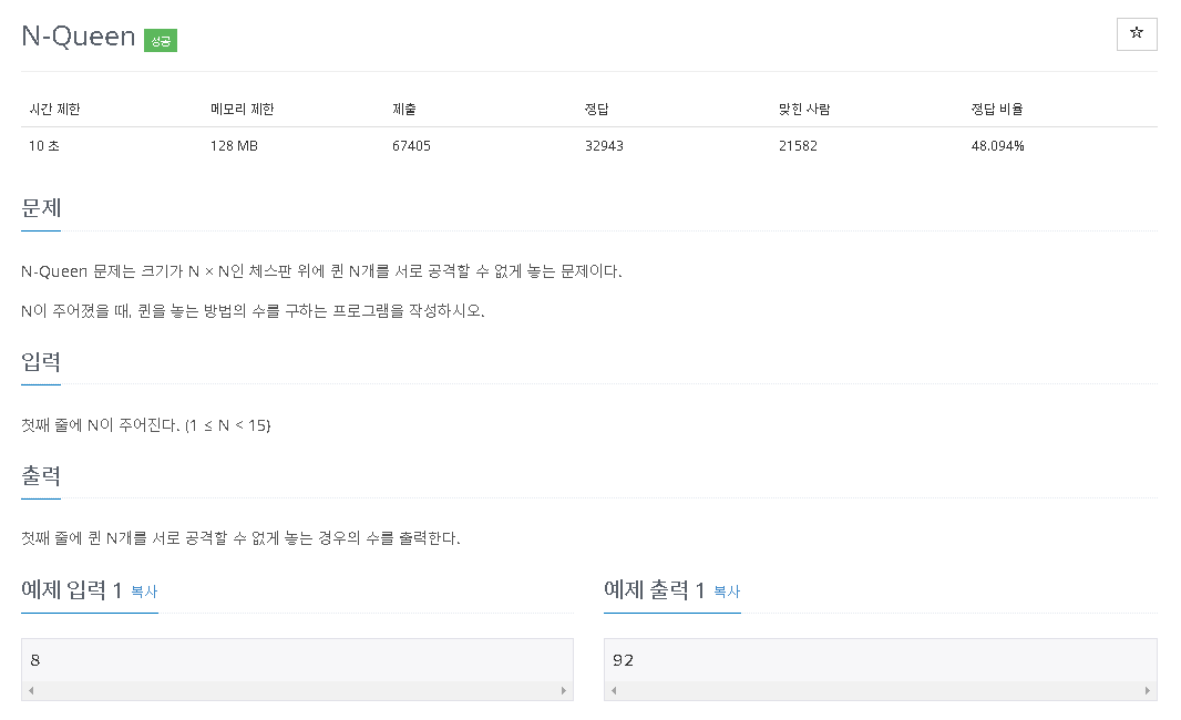 N-Queen 문제는 크기가 N × N인 체스판 위에 퀸 N개를 서로 공격할 수 없게 놓는 문제이다. N이 주어졌을 때, 퀸을 놓는 방법의 수를 구하는 프로그램을 작성하시오.