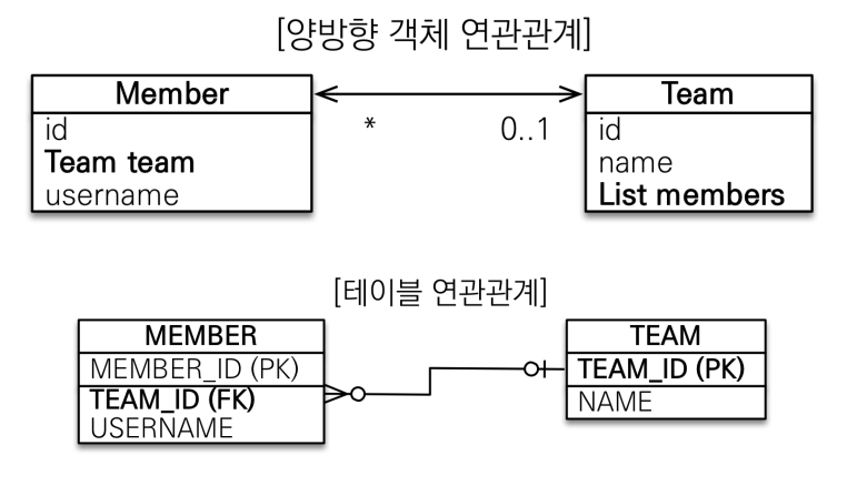 - 객체의 양방향 관계는 사실 양방향 관계가 아니라 서로 다른 단 뱡향 관계 2개다