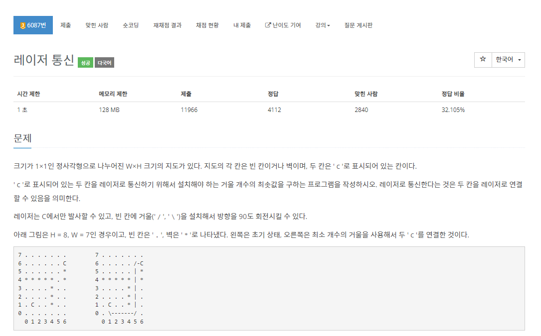 크기가 1×1인 정사각형으로 나누어진 W×H 크기의 지도가 있다. 지도의 각 칸은 빈 칸이거나 벽이며, 두 칸은 'C'로 표시되어 있는 칸이다. 'C'로 표시되어 있는 두 칸을 레이저로 통신하기 위해서