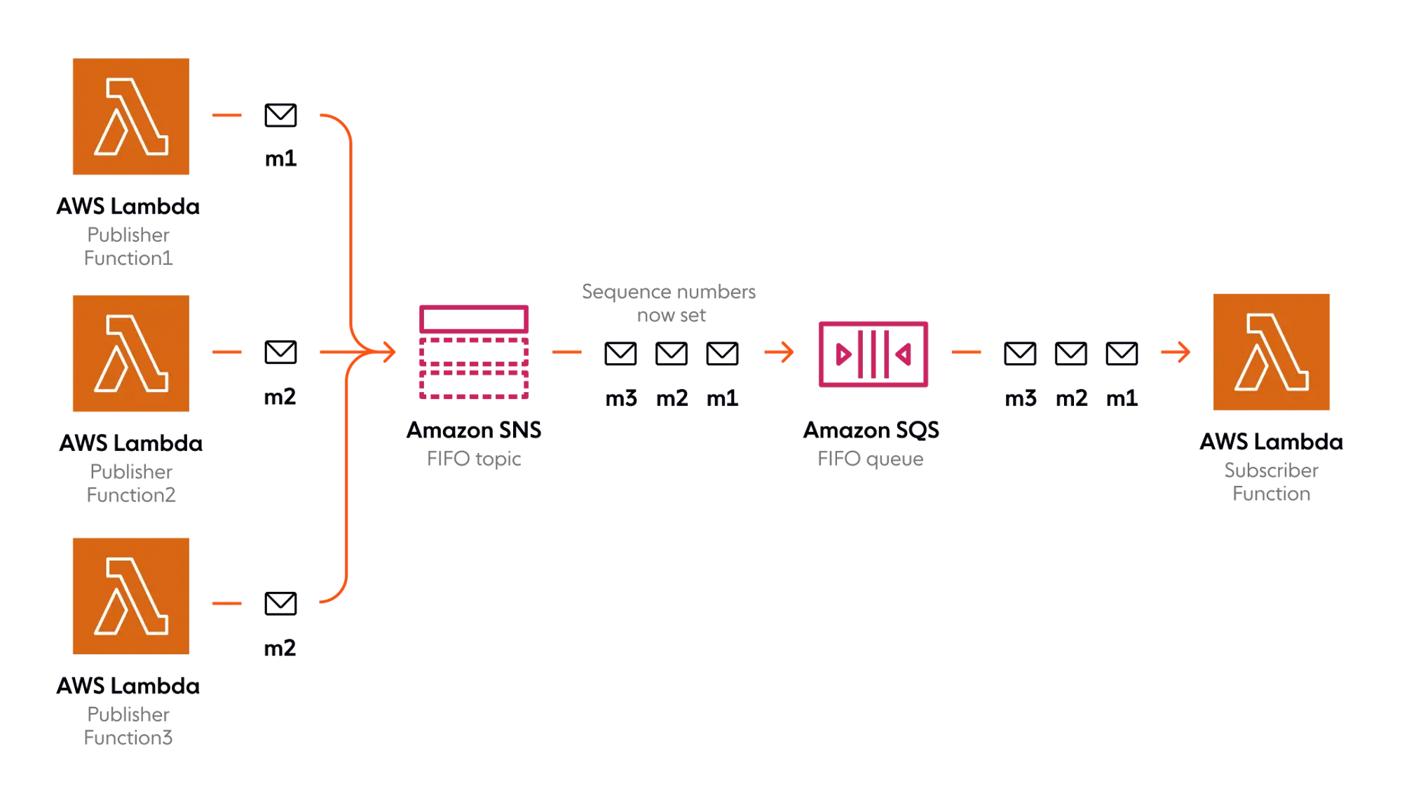 또한 SNS와 SQS를 결합하여 엔드 투 엔드 메시지 정렬을 보장할 수 있다. 예를 들어, 메시지가 Topic에 게시되는 정확한 순서로 구독된 SQS FIFO 대기열에 메시지를 배달하는 SNS Topic을 사용할 수 있다. SQS FIFO 큐의 소비자는 큐로 전송되는 것과 동일한 순서로 메시지를 수신한다.