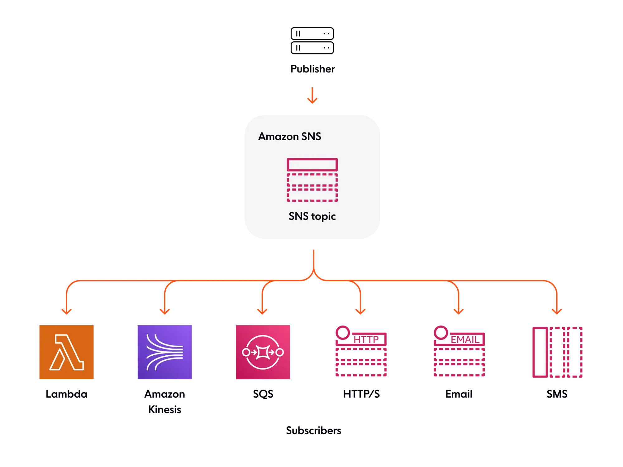 Publisher 는 Topic에 대한 메시지를 게시(pub)하고 Consumer 는 메시지를 수신하기 위해 이러한 Topic에 가입(sub)하여 Publisher가 SNS에 메시지를 보낼 때 메시지가 Subscriber에게 푸시된다.