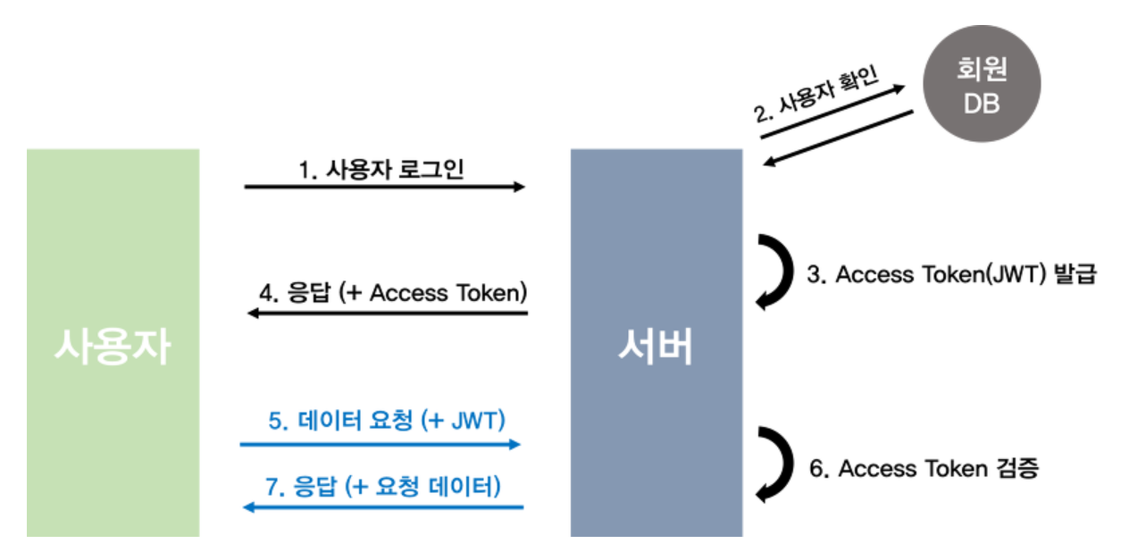 - 서버는 로그인 이후의 요청에 함께 실려온 토큰을 검증하는 과정을 검증이 성공적으로 끝났다면 권한이 있는 사용자라고 생각하고 요청된 데이터를 응답 (인가)
