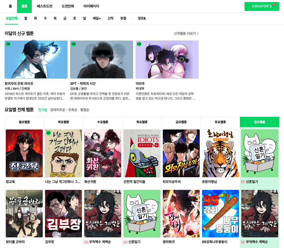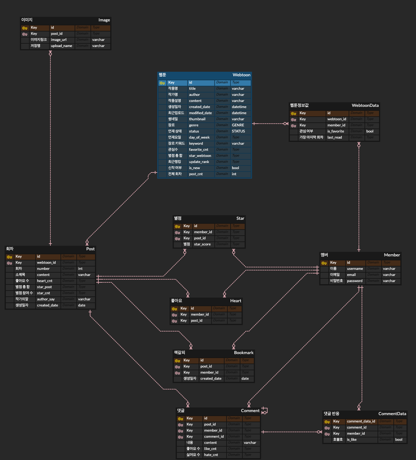 어릴적부터 웹툰을 좋아해서 네이버 웹툰 페이지를 참고하여 화면 단위로 요구사항을 정리하고 DB 설계를 해보았다.