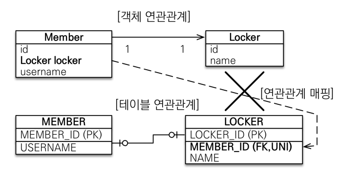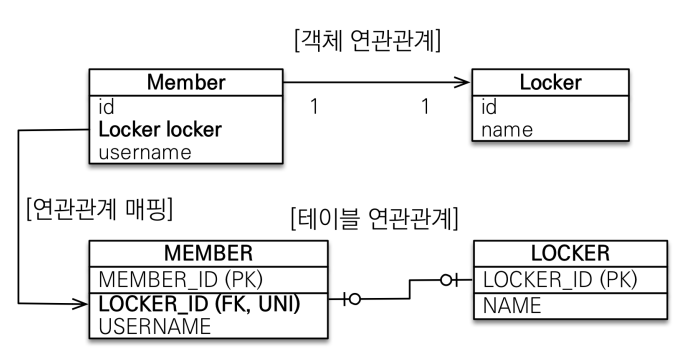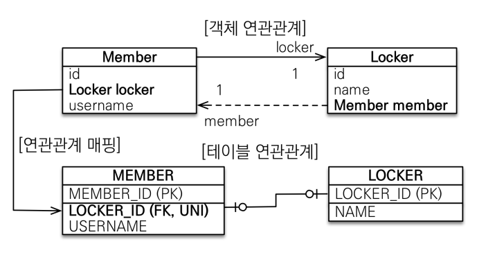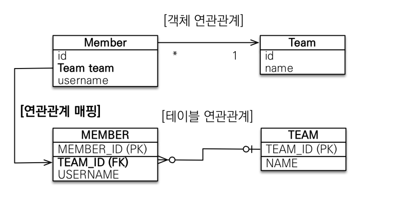 - 테이블은 외래 키 하나로 두 테이블이 연관관계를 맺음