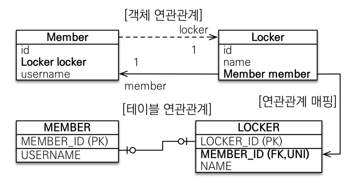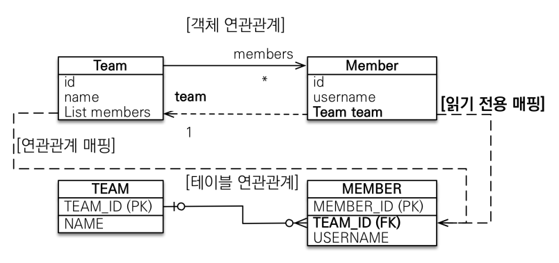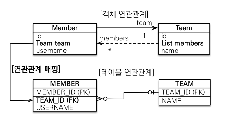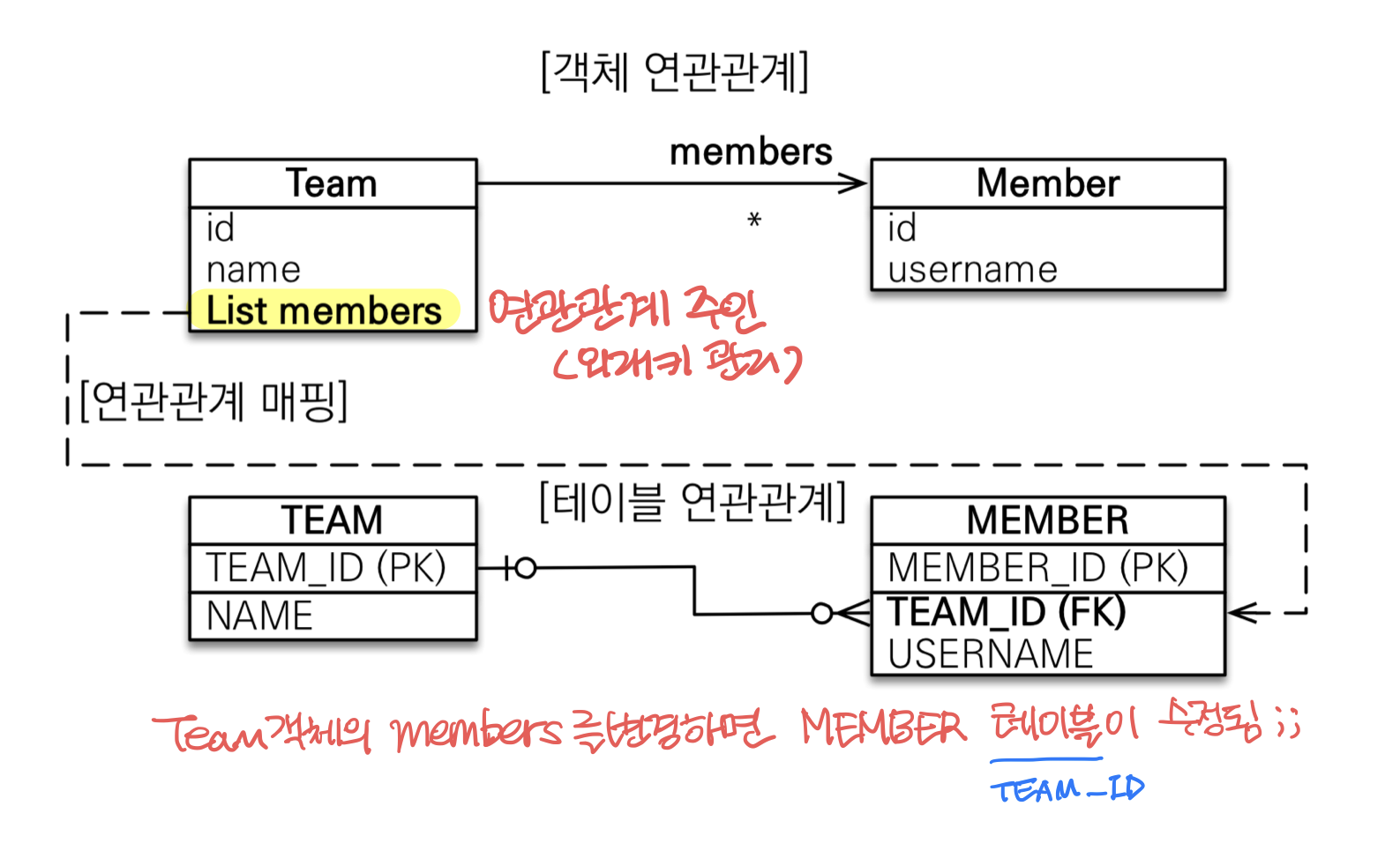 - 객체와 테이블의 차이 때문에 반대편 테이블의 외래 키를 관리하 는 특이한 구조