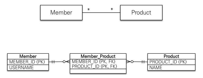 - 관계형 데이터베이스는 정규화된 테이블 2개로 다대다 관계를 표현할 수 없음