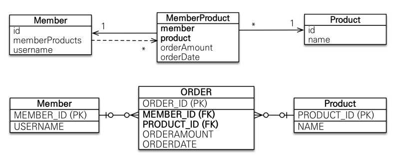 - 객체는 컬렉션을 사용해서 객체 2개로 다대다 관계 가능