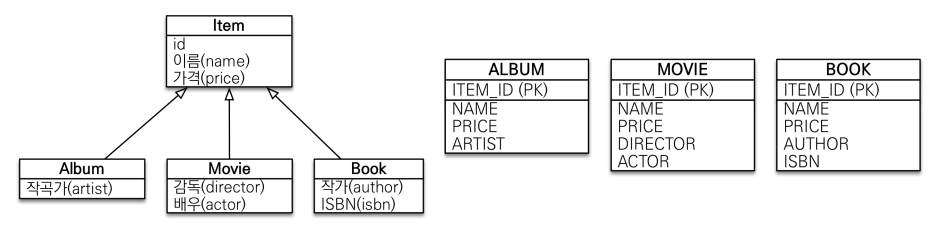 - TABLE_PER_CLASS: 구현 클래스마다 테이블 전략
